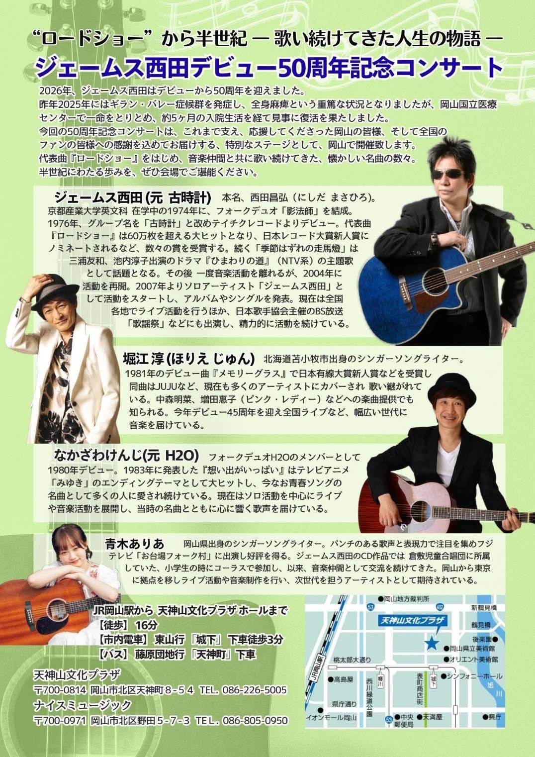 岡山市、天神山文化プラザホールにて、デビュー50周年記念コンサートの開催が決定致しました。